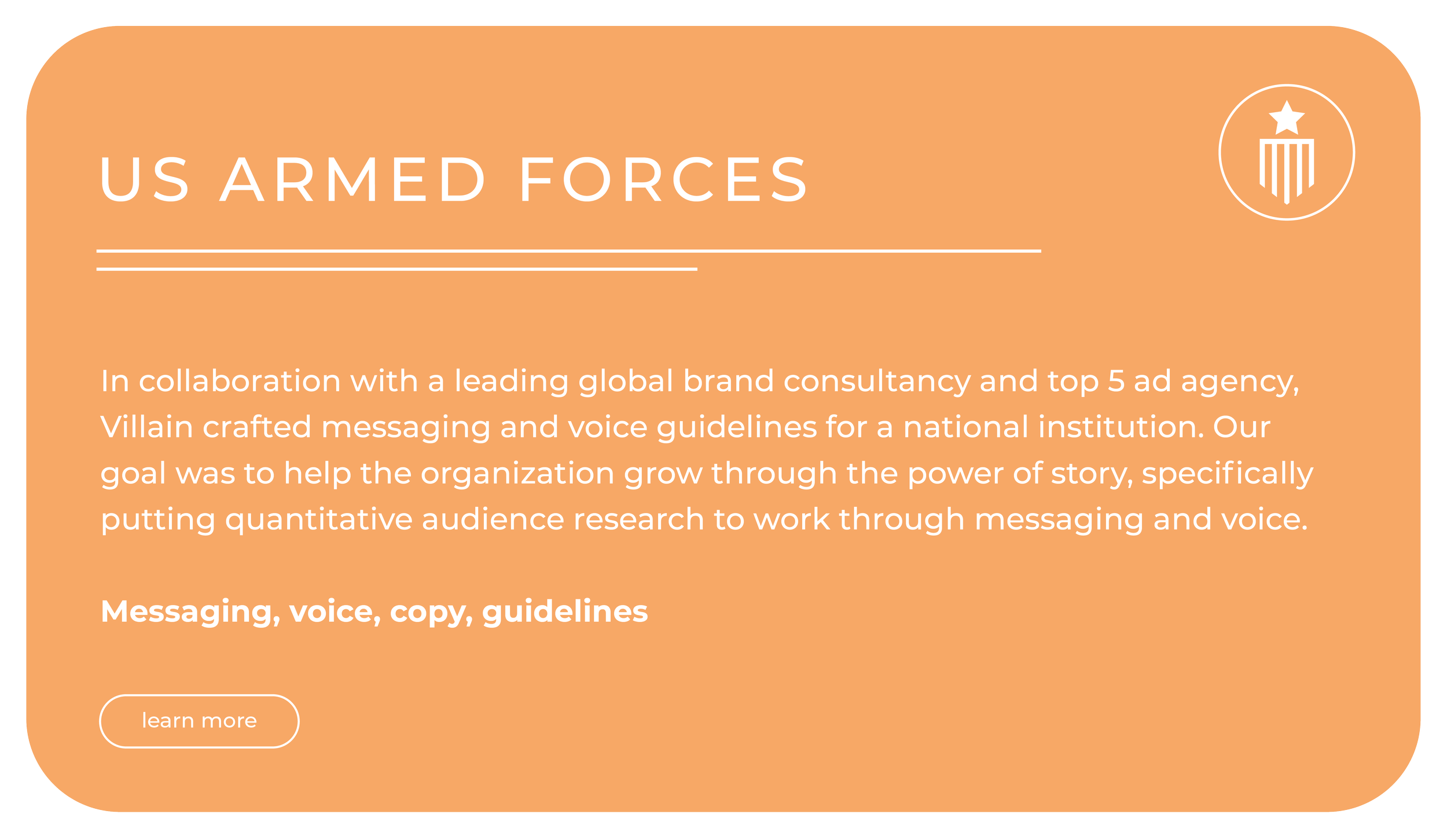 In collaboration with a leading global brand consultancy and top 5 ad agency, Villain crafted messaging and voice guidelines for a national institution. Our goal was to help the organization grow through the power of story, specifically putting quantitative audience research to work through messaging and voice.